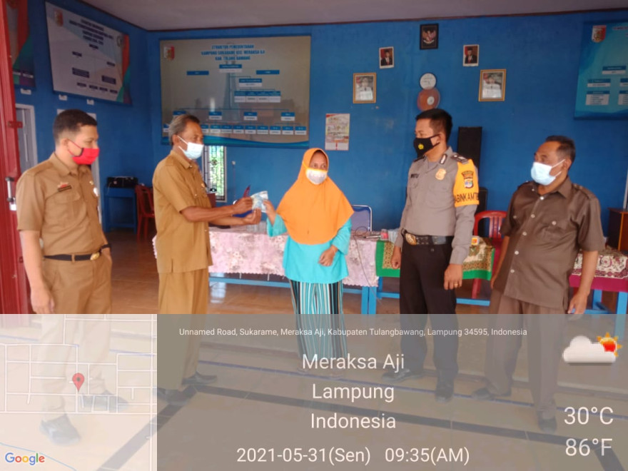 senin,31-05-2021 , Penyaluran BLT-DD Tahun 2021 Tahap 4 (April) ini, sebesar Rp.300.000/KPM, dengan jumlah Keluarga Penerima Manfaat sebanyak 24 (KPM) yang ada dikampung Sukarame Kecamatan Meraksa Aji Kabupaten Tulang Bawang dalam penyaluran BLT-DD Tersebut dipimpin Langsung Oleh PJ. Kepala Kampung Sukarame (Bpk. Suroso Sutrisno,) didamping Oleh Bapak Sugeng selaku ketua BPK, dan juga dihadiri Uspika Kecamatan Meraksa aji,Bhabinkamtibmas Kampung Sukarame BRIGPOL. I Putu Artika dari Polsek Gedung Aji.